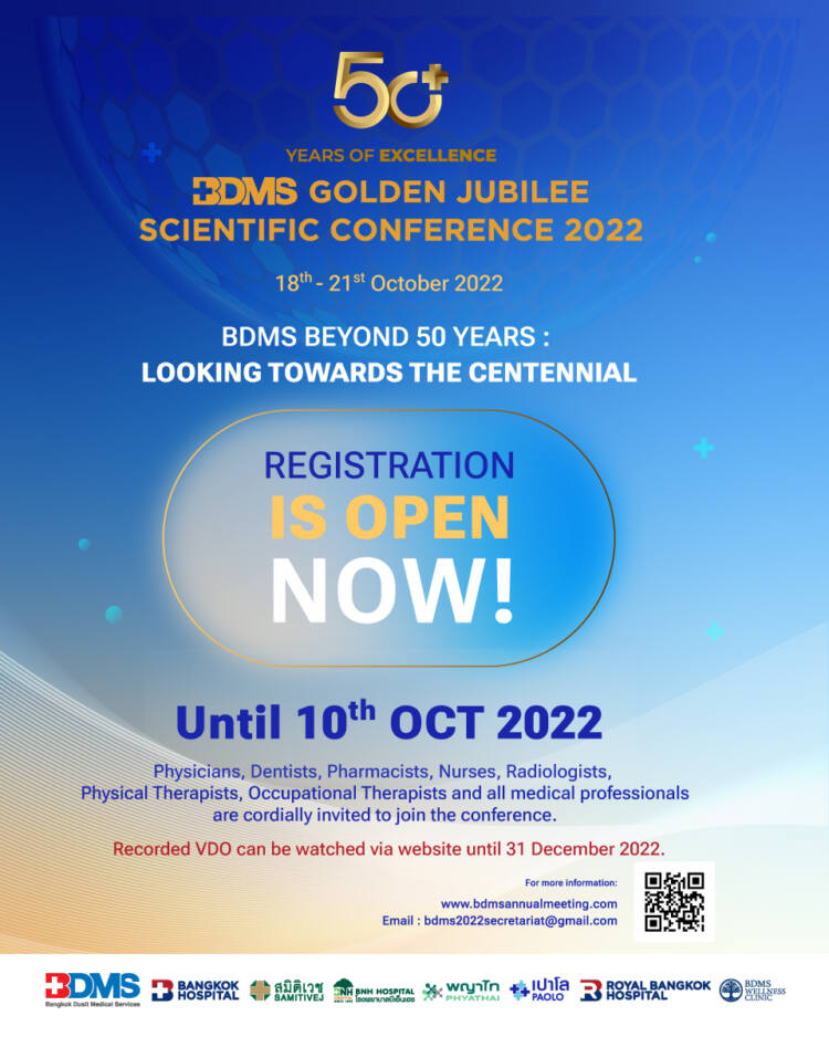บริษัท กรุงเทพดุสิตเวชการ จำกัด (มหาชน) หรือ BDMS ขอเชิญชวนแพทย์ ทันตแพทย์ พยาบาล เภสัชกร นักรังสีเทคนิค นักกายภาพบำบัด นักกิจกรรมบำบัด บุคลากรทางการแพทย์และผู้สนใจ เข้าร่วมงานประชุมวิชาการออนไลน์ “BDMS Golden Jubilee Scientific Conference 2022” ภายใต้แนวคิด “BDMS Beyond 50 Years : Looking Towards The Centennial” รับฟังการบรรยายทางวิชาการและแลกเปลี่ยนความรู้ที่น่าสนใจในหัวข้อ อาทิ ทิศทางการเปลี่ยนแปลงของวิถีการดำเนินชีวิตและมาตรฐานของโรงพยาบาลหลังภาวะ pandemic เทคนิคการรักษาแนวใหม่ ในโรคต่างๆ อาทิ โรคมะเร็งเต้านม โรคเบาหวาน ภาวะผู้มีบุตรยาก แนวทางการผ่าตัดโรคหลอดเลือดหัวใจวิถีใหม่ โมเดลการดูแลผู้ป่วยสูงอายุวิกฤตฉุกเฉิน เทคโนโลยีดิจิตัลช่วยทันตแพทย์ใส่รากฟันเทียม บทบาทของทันตกรรมช่วยจัดการภาวะนอนกรน เวชศาสตร์นิวเคลียร์เทรนด์ใหม่ช่วยลดผลข้างเคียงในการรักษาผู้ป่วยมะเร็ง การพัฒนาคุณภาพการบริการทางการแพทย์อย่างยั่งยืน (Sustainable Quality Innovation) มุมมองใหม่ยุคดิจิทัลในวิชาการพยาบาล อัพเดทแนวทางการใช้วัคซีนเพื่อรักษา COVID-19 Robot-assisted Therapy ในผู้ป่วยหลอดเลือดสมอง แนวทาง PDPA เพิ่มมาตรการป้องกันระบบสาธารณสุข ฯลฯ โดยวิทยากรผู้ทรงคุณวุฒิจากองค์กรชั้นนำของไทยและต่างประเทศ ในระหว่างวันที่ 18 – 21 ตุลาคม 2565 เปิดรับลงทะเบียนออนไลน์ ตั้งแต่วันนี้ – 10 ตุลาคม 2565 อัตราค่าลงทะเบียน 500 บาท (เข้าร่วมงานได้ 4 วัน) สามารถลงทะเบียนเข้าร่วมการประชุม ได้ที่ https://bit.ly/3L0x9aR ติดตามหัวข้อวิชาการในแต่ละสาขาเพิ่มเติม และหน่วยกิตคะแนนการศึกษาต่อเนื่องแต่ละวิชาชีพ ได้ที่ http://www.bdmsannualmeeting.com