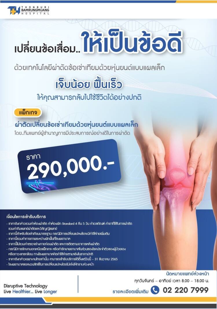 รพ.ธนบุรี บำรุงเมือง พร้อมที่จะดูแลทุกปัญหาข้อเข่า เปลี่ยนข้อเสื่อม … ให้เป็นข้อดีเพราะโรคข้อเข่าเสื่อมเกิดการใช้งานข้อเข่า การทำกิจกรรม หรือกิจวัตรประจำวันที่มีแรงกดต่อข้อเข่าที่มากเกินไป จึงมอบ แพ็กเกจผ่าตัดข้อเข่าเสื่อมด้วยหุ่นยนต์แบบแผลเล็กที่จะทำให้เจ็บน้อย ฟื้นตัวเร็ว และสามารถกลับไปใช้ชีวิตได้อย่างปกติ โดย ทีมแพทย์ผู้ชำนาญการมีประสบการณ์อย่างดีในการผ่าตัด ราคา 290,000 บาท ราคาดังกล่าวรวมค่าแพทย์ผ่าตัดและแพทย์วิสัญญี ค่าห้องผ่าตัด ห้องพัก Standard 4 คืน 5 วัน ค่าเวชภัณฑ์ ค่ายาที่ใช้ในการผ่าตัด ค่ากายภาพระหว่างพักฟื้นที่ รพ. ในกรณีมีการรักษานอกเหนือจากแพ็กเกจ ค่ารักษาพยาบาลในส่วนของโรคประจำตัวหรือภาวะแทรกซ้อน ทางโรงพยาบาลจะคิดค่าใช้จ่ายตามจริง การผ่าตัดจะขึ้นกับดุลยพินิจของแพทย์และเงื่อนไขเป็นไปตามที่ รพ. กำหนด สามารถรับบริการได้ตั้งแต่ 14 กันยายน – 31 ธันวาคม 2565 สอบถามเพิ่มเติมได้ที่ ศูนย์กระดูกและข้อ ชั้น 3 โรงพยาบาลธนบุรี บำรุงเมือง โทร. 02-220-7999 ต่อ 83060 ไลน์: https://lin.ee/AcCNqYl อีเมล info@thonburibamrungmuang.com และ เว็บไซต์ https://www.thonburibamrungmuang.com