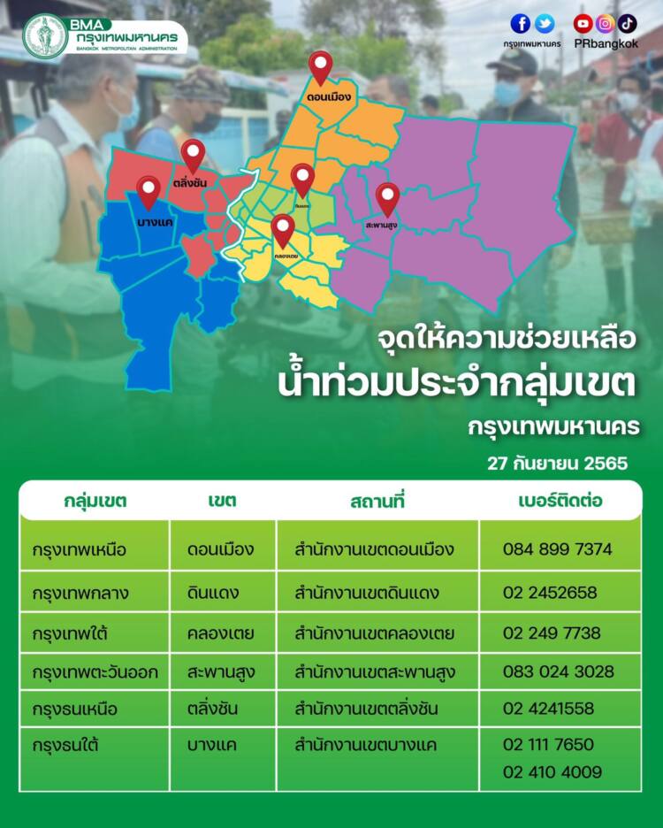 สำหรับจัดเตรียมหน่วยช่วยเหลือประชาชน รถรับ-ส่ง ศูนย์ซ่อม รถลาก เพื่ออำนวยความสะดวกในเส้นทางต่าง ๆ หากประชาชนได้รับความเดือดร้อน สามารถแจ้งได้ที่ “จุดให้ความความช่วยเหลือน้ำท่วมประจำกลุ่มเขต” ดังนี้