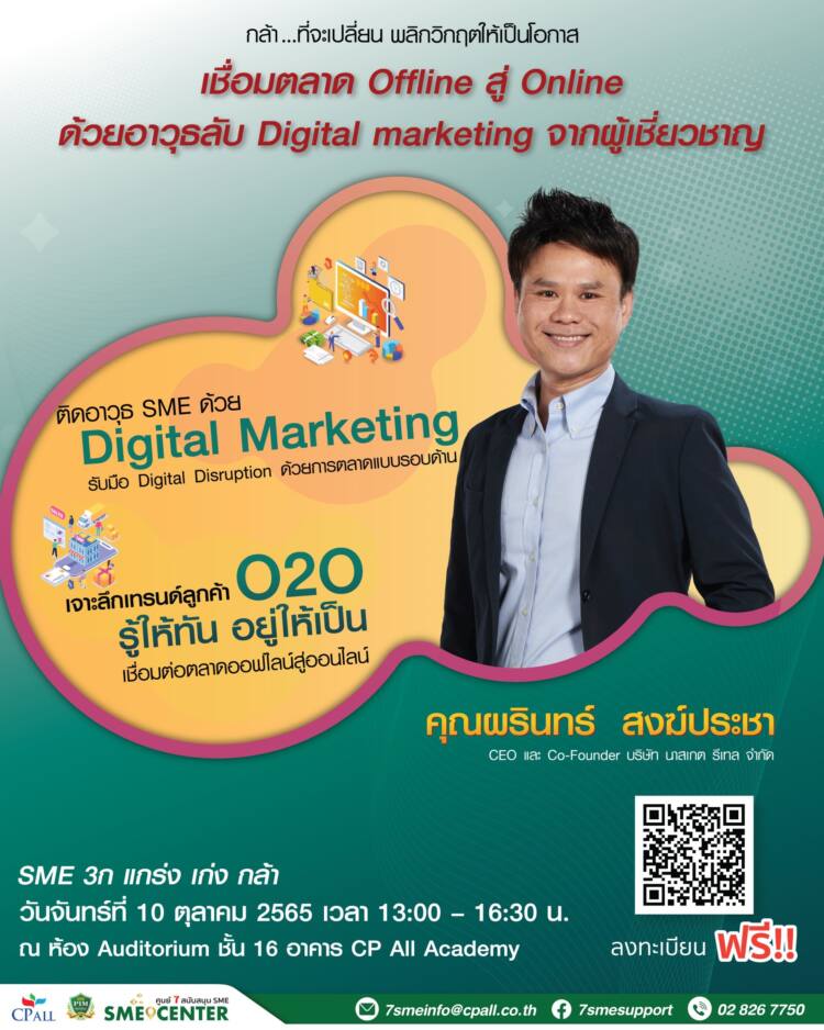 ศูนย์ 7 สนับสนุน SME ภายใต้การดำเนินงานของซีพี ออลล์ จับมือ สถาบันการจัดการปัญญาภิวัฒน์ (PIM) จัดงานสัมมนา SME 3ก แกร่ง เก่ง กล้า ครั้งที่ 3 หัวข้อ “เจาะลึกเทรนด์ลูกค้า O2O รู้ให้ทันอยู่ให้เป็น เชื่อมต่อตลาดออฟไลน์สู่ออนไลน์” โดย นายผรินทร์ สงฆ์ประชา CEO และผู้ร่วมก่อตั้ง บริษัท นาสเกต รีเทล จำกัด เพื่อช่วยติดอาวุธด้านความรู้เกี่ยวกับ Digital Marketing พร้อมเสริมศักยภาพ SME ไทยให้สามารถเติบโตได้อย่างแข็งแกร่งและยั่งยืน ในวันจันทร์ที่ 10 ตุลาคม 2565 เวลา 13.00-16.30 น. ณ ห้อง Auditorium ชั้น 16 อาคาร CP All Academy สถาบันการจัดการปัญญาภิวัฒน์ ถ.แจ้งวัฒนะ
