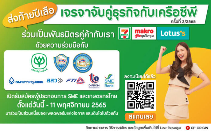 เครือเจริญโภคภัณฑ์ (ซีพี) ร่วมกับหอการค้าไทยและสภาหอการค้าแห่งประเทศไทย กรมส่งเสริมอุตสาหกรรม สภาอุตสาหกรรมแห่งประเทศไทย ธนาคารพัฒนาวิสาหกิจขนาดกลางและขนาดย่อมแห่งประเทศไทย ธนาคารกรุงเทพ จำกัด (มหาชน) และสำนักงานส่งเสริมวิสาหกิจขนาดกลางและขนาดย่อม (สสว.) เปิดเวทีเจรจาจับคู่ธุรกิจ SME Online Business Matching ครั้งที่ 3 ประจำปี 2565 ระหว่างวันที่ 29-30 พฤศจิกายน 2565 ภายใต้โครงการ “แพลตฟอร์มแห่งโอกาส” เพื่อเปิดโอกาสให้ผู้ประกอบการSME และเกษตรกรไทยได้มาเจรจาธุรกิจนำเสนอสินค้าทุกประเภททั้งสินค้าอุปโภคและบริโภคเพื่อจัดจำหน่ายกับ 3 กลุ่มธุรกิจค้าปลีกในเครือซีพี ได้แก่ เซเว่น อีเลฟเว่น แม็คโคร และโลตัส พร้อมการได้รับคำแนะนำจากพันธมิตรในโครงการ