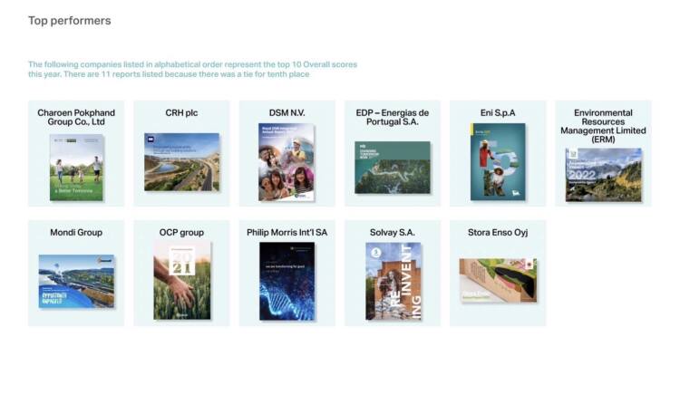 โดยจัดอยู่ในกลุ่มคะแนนสูงสุดติดอันดับ 1 ใน 10 ร่วมกับบริษัทชั้นนำระดับโลก ได้แก่ CRH plc, DSM N.V., EDP-Energias de Portugal S.A., Eni S.p.A, Environmental Resources Management Limited (ERM), Mondi Group, OCP group, Philip Morris Int’I SA, Sovay S.A. และStora Enso Oyj ทั้งนี้เครือซีพีถือเป็นบริษัทเอกชนไทยรายเดียวที่ได้คะแนนสูงสุดจนติดอันดับท็อป 10 ในการจัดทำรายงานความยั่งยืนในกลุ่มธุรกิจชั้นนำ นับเป็นความภาคภูมิใจของเครือเจริญโภคภัณฑ์ และยังสะท้อนความมุ่งมั่นขององค์กรในการก้าวสู่เป้าหมายการพัฒนาที่ยั่งยืน ค.ศ. 2030 ตอกย้ำความพร้อมที่จะเป็นองค์กรผู้นำด้านความยั่งยืนระดับโลก