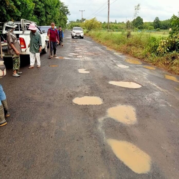 จนปัจจุบันเป็นหลุมเป็นบ่อ เคยแจ้งไปทางผู้รับผิดชอบหลายครั้งหลายคราว ให้ช่วยมาซ่อมแซมให้ เขาก็บอกว่า ได้งบประมาณแล้ว แต่สุดท้ายมีการโยกงบประมาณไปลงที่อื่น ชาวบ้านได้แต่งงกันมาก มีความเดือดร้อน จึงพยายามรวบรวมเวินซื้อหินมาถมหลายคร้ัง แต่ที่ผ่านมากลับมี ฝนตกหนัก หินไหลไปหมด ยิ่งช่วงนี้หนักหนาสาหัส เพราะน้ำท่วมรถบรรทุกใหญ่เขามาวิ่ง เมื่อน้ำลดลงก็กล่ยเป็นหลุมลึก ตนและชาวบ้าน ขี่มอเตอร์ไซค์ หลบหลุมไม่ทัน ล้มกลิ้งได้นับบาดเจ็บไปหลายราย ขอวอนให้ผู้รับผิดชอบมาเร่งแก้ไขให้ด้วย เพราะกำลังถูกขนานนามว่า บ้านสามพันโบก สามพันหลุมแล้ว