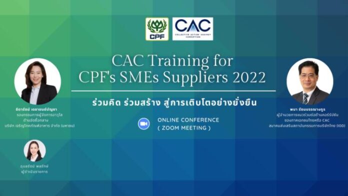 บริษัท เจริญโภคภัณฑ์อาหาร จำกัด (มหาชน) หรือ ซีพีเอฟ ร่วมกับ สมาคมส่งเสริมสถาบันกรรมการบริษัทไทย (IOD) จัดอบรมแนวร่วมต่อต้านคอร์รัปชันสำหรับคู่ค้าธุรกิจ SME (CAC Training for CPF’s SMEs Supplier 2022) ต่อเนื่องเป็นปีที่ 2 ให้กับคู่ค้า SME จำนวนกว่า160 บริษัท เพิ่มความหนักรู้และแบ่งปันประสบการณ์การดำเนินการป้องกันการให้สินบนและทุจริต ส่งเสริมการยกระดับมาตรฐานด้านความโปร่งใส และแนวปฏิบัติป้องกันและต่อต้านการทุจริต และปีนี้มีคู่ค้า SMEs อีกกว่า 20 บริษัทพร้อมจับมือกับ CPF ประกาศเป็นแนวร่วมต่อต้านคอร์รัปชันของภาคเอกชน