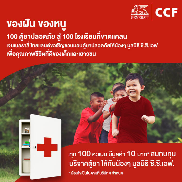 เจนเนอราลี่ ไทยแลนด์ ชวนลูกค้าเจนเนอราลี่ ทั่วประเทศ ร่วมเป็นส่วนหนึ่งในโครงการ“ของฝัน ของหนู” เปลี่ยนคะแนนสะสมในแอปพลิเคชัน GEN365 เป็นการบริจาคโดยร่วมสมทบทุนเพื่อจัดซื้อ 100 ตู้ยาที่ปลอดภัย สู่ 100 โรงเรียนที่ขาดแคลน กับมูลนิธิ ซี.ซี.เอฟ (Community Children Foundation) สำหรับจัดซื้อตู้ยาและยาสามัญ รวมถึงเวชภัณฑ์ที่จำเป็นให้แก่น้อง ๆ เยาวชนในเขตพื้นที่ห่างไกลได้ใช้สำหรับการปฐมพยาบาลเบื้องต้น เพื่อเป็นส่วนหนึ่งในการดูแลรักษา และ เพื่อสร้างคุณภาพชีวิตที่ดียิ่งขึ้น