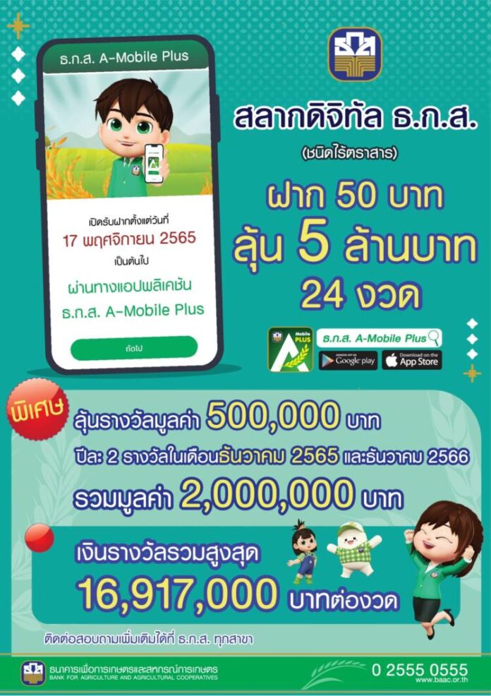 ธ.ก.ส. เปิดรับฝาก “สลากดิจิทัล ธ.ก.ส.” ผ่านแอปพลิเคชัน A-Mobile Plus หน่วยละ 50 บาท วงเงินรวม 30,000 ล้านบาท ฝากครบ 2 ปี ได้รับดอกเบี้ยหน่วยละ 0.07 บาท พร้อมลุ้นรางวัลที่ 1 สูงสุด 5 ล้านบาท รางวัลพิเศษ ปีละ 2 ครั้ง เป็นเงินรางวัล 2 ล้านบาท และรางวัลอื่น ๆ รวมมูลค่ากว่า 16 ล้านบาทต่อเดือน โดยยกเว้นภาษีดอกเบี้ยสำหรับบุคคลธรรมดา เปิดรับฝาก ตั้งแต่ 17 พฤศจิกายน 2565 เป็นต้นไป