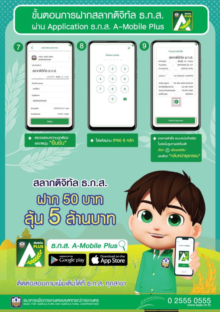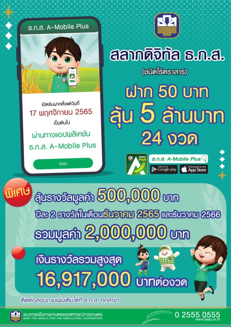 นายธนารัตน์ งามวลัยรัตน์ ผู้จัดการธนาคารเพื่อการเกษตรและสหกรณ์การเกษตร (ธ.ก.ส.) เปิดเผยว่า ธ.ก.ส. เปิดรับฝาก “สลากดิจิทัล ธ.ก.ส.” ผ่านแอปพลิเคชัน A-Mobile Plus เพื่อสนับสนุนการออมเงินและอำนวยความสะดวกในการเข้าถึงผลิตภัณฑ์เงินฝากและสลากออมทรัพย์ ธ.ก.ส. แก่ลูกค้าและประชาชนทั่วไป ในราคาหน่วยละ 50 บาท วงเงินรวม 30,000 ล้านบาท พร้อมรับสิทธิ์ลุ้นเงินรางวัลมากมาย สูงสุด 5 ล้านบาท โดยสลากดิจิทัล ธ.ก.ส. เป็นสลากชนิดไร้ตราสาร มีอายุรับฝาก 2 ปี เมื่อฝากครบกำหนดไถ่ถอนจะได้รับดอกเบี้ยหน่วยละ 0.07 บาท หรือคิดเป็นอัตราดอกเบี้ยร้อยละ 0.07 ต่อปี นอกจากนี้ยังได้ลุ้นรางวัลทุกวันที่ 16 ของเดือน และวันที่ 17 มกราคมของทุกปี รวม 24 ครั้ง
