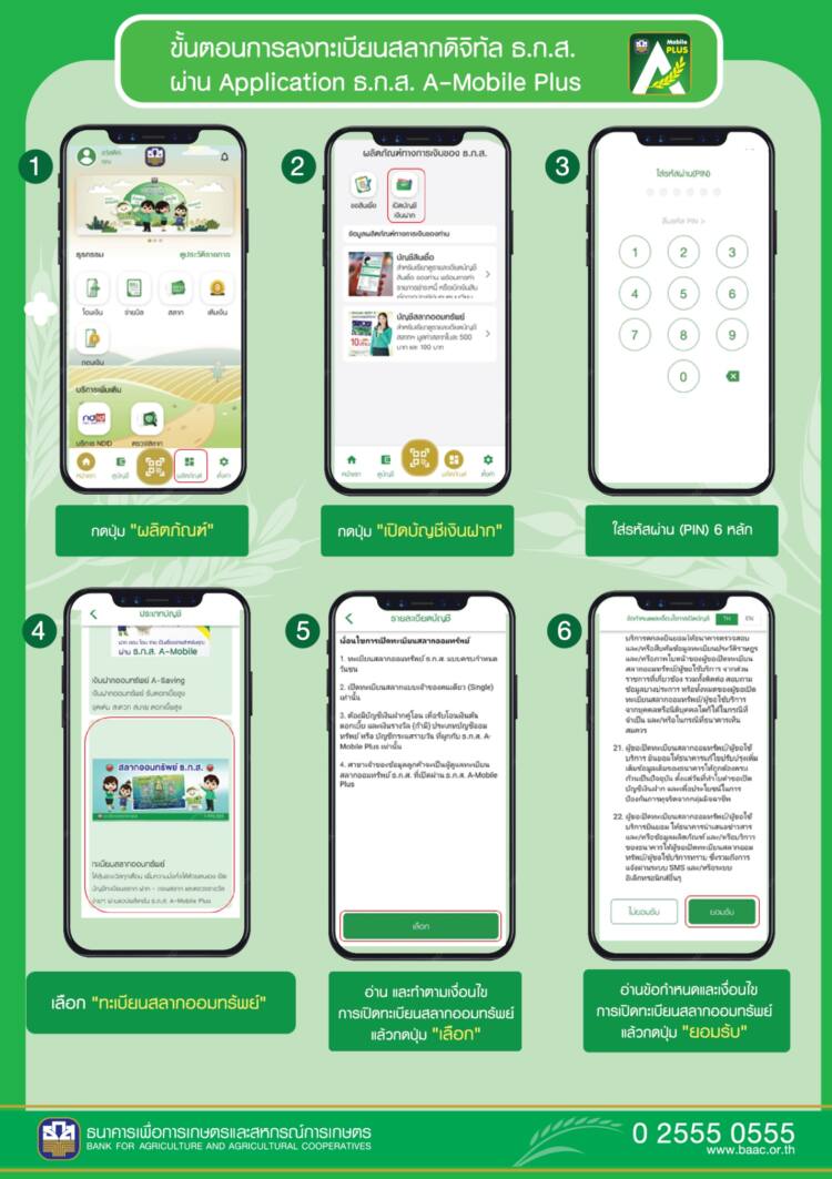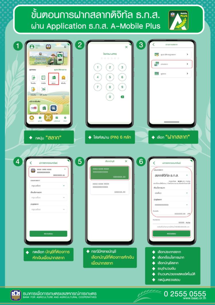 ทั้งนี้ ลูกค้าจะได้รับ e-Slip ไว้เป็นหลักฐานในการฝากสลากบันทึกไว้ในอัลบั้มภาพในโทรศัพท์เคลื่อนที่อัตโนมัติ โดยสามารถตรวจสอบข้อมูลหมายเลขสลาก รายการธุรกรรมและประวัติการถูกรางวัลได้ง่าย ๆ ผ่าน แอปพลิเคชัน A-Mobile Plus และสามารถรับชมการถ่ายทอดสดการออกสลากดิจิทัล ธ.ก.ส. ได้ทางสถานีวิทยุกระจายเสียงแห่งประเทศไทย คลื่นความถี่ AM 891 กิโลเฮิรตซ์ เว็บไซต์ www.baac.or.th Facebook Page “BAAC Thailand” Youtube Channel “BAAC Thailand” หรือตรวจผลรางวัลทาง A-Mobile Plus โดยท่านที่สนใจสามารถติดต่อสอบถามรายละเอียดเพิ่มเติมเกี่ยวกับสลากดิจิทัล ธ.ก.ส. ได้ที่ ธ.ก.ส. ทุกสาขาทั่วประเทศ หรือที่ Call Center 02 555 0555