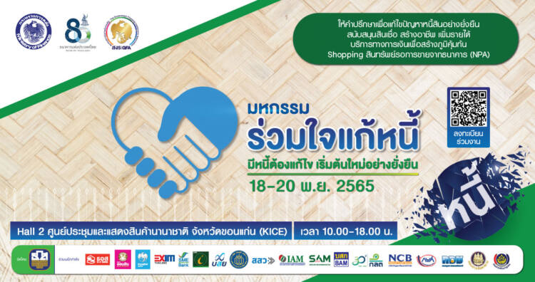 ขอเชิญชวนลูกหนี้ที่ประสงค์รับความช่วยเหลือและประชาชนทั่วไปที่สนใจ ร่วมงาน “มหกรรมร่วมใจแก้หนี้ มีหนี้ต้องแก้ไข เริ่มต้นใหม่อย่างยั่งยืน” ครั้งที่ 2 ระหว่างวันที่ 18 – 20 พฤศจิกายน 2565 ณ ฮอลล์ 2 ศูนย์ประชุมและแสดงสินค้านานาชาติ จังหวัดขอนแก่น (KICE)