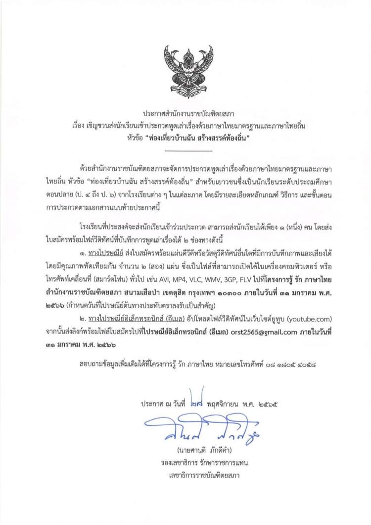 สำนักงานราชบัณฑิตยสภาขอเชิญโรงเรียนระดับประถมศึกษาทั่วประเทศ ส่งนักเรียนระดับประถมศึกษาตอนปลาย (ป. ๔ ถึง ป. ๖) เข้าร่วมประกวดพูดเล่าเรื่องด้วยภาษาไทยมาตรฐานและภาษาไทยถิ่น