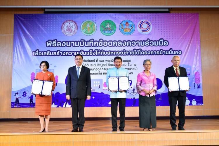 กระทรวงเกษตรและสหกรณ์ โดยกรมส่งเสริมสหกรณ์ และกรมตรวจบัญชีสหกรณ์ได้ลงนามบันทึกความร่วมมือกับสถาบันพัฒนาองค์กรชุมชน (องค์การมหาชน) ซึ่งเป็นหน่วยงานภายใต้การกำกับดูแลของกระทรวงการพัฒนาสังคมและความมั่นคงของมนุษย์ เพื่อบูรณาการความร่วมมือระหว่าง 3 หน่วยงาน ในการเสริมสร้างความเข้มแข็งให้กับสหกรณ์ภายใต้โครงการบ้านมั่นคงทั่วประเทศ ซึ่งเป็นองค์กรชุมชนที่ใช้สหกรณ์เป็นเครื่องมือในการแก้ไขปัญหาที่อยู่อาศัยชุมชน ผู้มีรายได้น้อย โดยการมีส่วนร่วมจากองค์กรชุมชนที่ดำเนินโครงการบ้านมั่นคง ในการส่งเสริมสนับสนุนการจัดตั้งสหกรณ์ ที่สอดคล้องกับเจตนารมณ์ของโครงการบ้านมั่นคง รวมถึงการส่งเสริมสนับสนุนให้เกิดการจัดทำระบบบัญชีตามมาตรฐานการบัญชีที่นายทะเบียนสหกรณ์กำหนด เพื่อให้สหกรณ์สามารถบริหารจัดการและดำเนินธุรกิจของสหกรณ์ได้อย่างมีประสิทธิภาพ มีธรรมาภิบาล ระยะเวลาดำเนินการ 3 ปี นับตั้งแต่วันที่ลงนามในบันทึกข้อตกลงความร่วมมือ