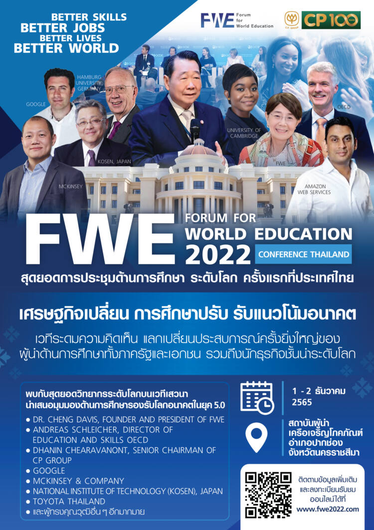 สำหรับการประชุมสัมมนา “Forum for World Education 2022 -เศรษฐกิจเปลี่ยน การศึกษาปรับ รับแนวโน้มอนาคต” ที่จะมีขึ้นระหว่าง 1-2 ธันวาคม 2565 จัดขึ้นทั้งในรูปแบบ Online และ On site โดย On site มีขึ้น ณ สถาบันผู้นำ เครือเจริญโภคภัณฑ์ อำเภอปากช่อง จังหวัดนครราชสีมา ส่วน Online สามารถลงทะเบียนออนไลน์รับชมออนไลน์ได้ที่ www.fwe2022.com
