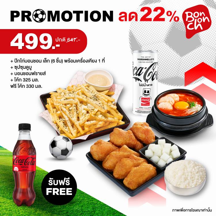 Bonchon สวรรค์ของนักรักไก่ทอด: Bonchon World Cup Set 3 ภายในเซ็ตประกอบไปด้วย ปีกไก่บอนชอน เล็ก (6 ชิ้น) พร้อมเครื่องเคียง 1 ที่, ซุปซุนดูบู, บอนชอนฟรายส์, โค้ก 325 มิลลิลิตร รับฟรี!! โค้ก 330 มล. ในราคา 499 บาท จาก 647 บาท