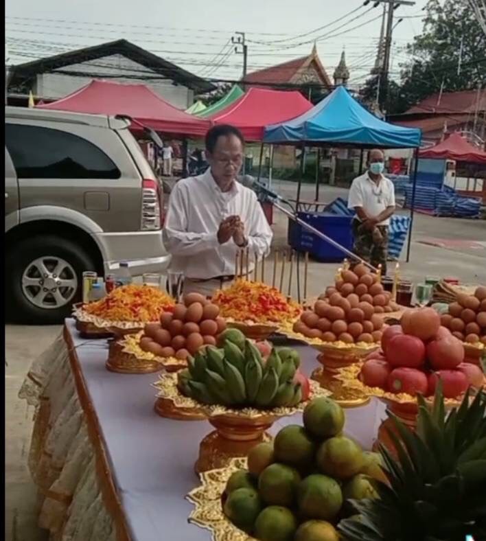 บัณฑิตสุรินทร์ ศรีแตงทอง ( แปะ บางกรวย ) อ่านโองการอัญเชิญครู บาอาจารย์ เทพเทวา และพระพุทธโสธร แล้วเปลี่ยนผ้าสไบห่ม