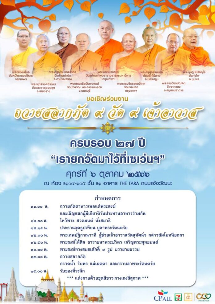 นางปรางรัตน์ เกียรติทรงศักดิ์ ผู้ช่วยกรรมการผู้จัดการ บริษัท ซีพี ออลล์ จำกัด (มหาชน) ผู้บริหารเซเว่น อีเลฟเว่น และเซเว่น เดลิเวอรี่ ในฐานะประธานพุทธปัญญาชมรม จะจัดงาน “ครบรอบ 27 ปี เรายกวัดมาไว้ที่เซเว่นฯ จัดงานถวายสลากภัต 9 วัด 9 เจ้าอาวาส” โดยนิมนต์พระสงฆ์ทรงสมณศักดิ์ 9 รูปจากหลายภูมิภาค เจริญพระพุทธมนต์ และบรรยายธรรม ซึ่งจัดขึ้นเป็นพิเศษ เพื่อให้ประชาชนได้มีโอกาสร่