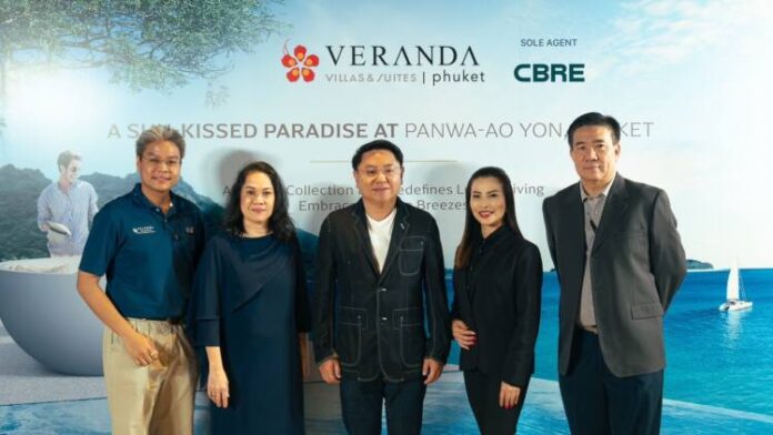ณัฐณภาส์ แสงสุวรรณ (ที่ 4 จากซ้าย) ผู้อำนวยการแผนกซื้อขายสังหาริมทรัพย์ ภูเก็ต บริษัท ซีบีอาร์อี (ประเทศไทย) จำกัด เข้าร่วมงานพรีเซลส์ A SUN-KISSED PARADISE AT PANWA – AO YON ของโครงการบ้านพักตากอากาศหรู “Veranda Villas & Suites – Phuket” ที่ประกอบด้วย วิลล่า 6 หลัง และคอนโดมิเนียม 12 ยูนิต มูลค่าโครงการรวมประมาณ 850 ล้านบาท บริเวณแหลมพันวาและอ่าวยน ซึ่งถือเป็นจุดชมวิวที่สวยที่สุดแห่งหนึ่งของจังหวัดภูเก็ต