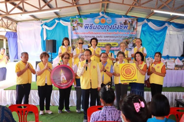 (8 ต.ค. 66) ที่องค์การบริหารส่วนตำบลโคกก่อง อำเภอเมืองสกลนคร จังหวัดสกลนคร นายชานนท์ วาสิกสิริ รองผู้ว่าราชการจังหวัดสกลนคร รักษาราชการแทนผู้ว่าราชการจังหวัดสกลนคร นายชยุต วงศ์วณิช รองผู้ว่าราชการจังหวัดสกลนคร นายไพรัตน์ จิตนภากาญจน์ ประธานเมตตาธรรมมูลนิธิสกลนคร นายสุรชัย เดชศิริอุดม รองประธานฯ พร้อมคณะแม่บ้านเมตตาธรรมมูลนิธิ หัวหน้าส่วนราชการ นางสาวจิราภรณ์ เบิกบานดีนายอำเภอเมืองสกลนคร หน่วยงานที่เกี่ยวข้อง ร่วมมอบถุงยังชีพให้กับชาวบ้านที่ได้รับผลกระทบจากพนังกั้นลำน้ำก่ำทีารับน้ำจากหนองหารเพื่อไหลลงน้ำโขง