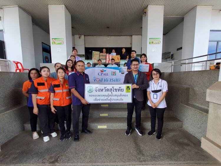 นายอธิปไตย ไกรราช หัวหน้าสำนักงานจังหวัดสุโขทัยรับมอบเครื่องอุปโภคบริโภค น้ำดื่มสะอาด จากชมรมจิตสาธารณะ ซีพี ออลล์ นำทีมโดยนายเทวเทพ สีระวัตร และนางสาวสาริณี อินทร์ประเสริฐ ผู้จัดการเขต บมจ.ซีพี ออลล์ พร้อมด้วยพนักงานเซเว่น อีเลฟเว่น และเซเว่น เดลิเวอรี่ เพื่อส่งกำลังใจและให้ความช่วยเหลือเร่งด่วนแก่ผู้ประสบอุทกภัยในจังหวัดสุโขทัย ตามปณิธานองค์กรของซีพี ออลล์ “Giving and Sharing” ณ สำนักงานจังหวัดสุโขทัย เมื่อเร็วๆ นี้