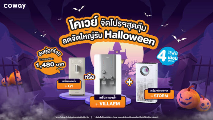 โคเวย์ (COWAY) แบรนด์เครื่องกรองน้ำและเครื่องฟอกอากาศชั้นนำระดับโลกจากเกาหลีใต้ จัดโปรโมชันรับวันฮาโลวีน ลดกระหน่ำตลอดเดือนตุลาคม จับคู่บริการ Subscription เครื่องกรองน้ำรุ่น G1 หรือ VILLAEM คู่กับเครื่องฟอกอากาศรุ่น STORM ในราคาสุดคุ้มเพียง 1,480 บาทต่อเดือน เพื่อช่วยคนไทยสร้างเสริมสุขภาพที่ดีแบบครบวงจร ทั้งน้ำดื่มสะอาดไม่ขาดตอนและอากาศที่สะอาดบริสุทธิ์ตลอดวัน