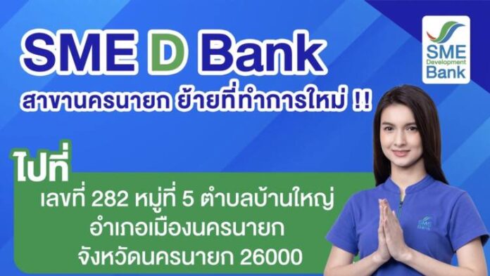 27 ต.ค.66 / ธนาคารพัฒนาวิสาหกิจขนาดกลางและขนาดย่อมแห่งประเทศไทย (ธพว.) หรือ SME D Bank สาขานครนายก แจ้งย้ายที่ทำการสาขาแห่งใหม่ จากที่เดิมไปตั้งอยู่ ณ เลขที่ 282 หมู่ที่ 5 ตำบลบ้านใหญ่ อำเภอเมืองนครนายก จังหวัดนครนายก 26000 ตั้งแต่วันที่ 30 ตุลาคม 2566 เป็นต้นไป โดยที่ตั้งสาขาใหม่ดังกล่าว เป็นทำเลอยู่ใจกลางเมือง พื้นที่ให้บริการกว้างขวาง สามารถอำนวยความสะดวกแก่ผู้ประกอบการเอสเอ็มอีที่มาติดต่อและใช้บริการได้เป็นอย่างดี สอบถามรายละเอียดเพิ่มเติมได้ที่ SME D Bank สาขานครนายก โทร.03-7316-161 ถึง 2, 08-5980-8087 หรือ Call Center 1357