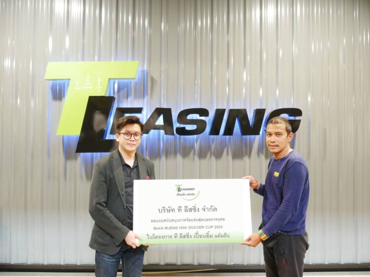 นายปรัชญา ติงสะ รองกรรมการผู้จัดการกลุ่มงานกลยุทธ์และพัฒนาธุรกิจ บริษัท ที ลีสซิ่ง จำกัด (ที่ 1 จากซ้าย) มอบทุนในโครงการ ที ลีสซิ่ง เปื้อนยิ้ม แต้มฝัน สนับสนุนการพัฒนาปรับปรุงสนามกีฬา ภายในชุมชนบ้านบึง เขตประเวศ กรุงเทพมหานครฯ เพื่อจัดงานแข่งขันฟุตบอลการกุศลภายในชุมชนใน กิจกรรม BAAN BUENG MINI SOCCER CUP 2023 โดยมี นายสุรศักดิ์ มูหะหมัด เหรัญญิกชุมชน (ที่ 2 จากซ้าย) เป็นตัวแทนรับมอบ ณ สำนักงาน ชั้น 3 ศูนย์การค้า พาราไดซ์ เพลส เมื่อเร็ว ๆ นี้