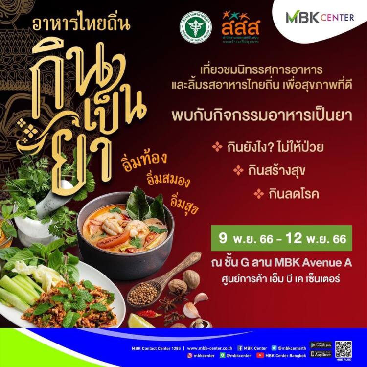 ศูนย์การค้าเอ็ม บี เค เซ็นเตอร์ ชวนสายสุขภาพมาเที่ยวชมงาน อาหารไทยถิ่น กินเป็นยา เสวนาวิชาการและนิทรรศการอาหารเป็นยา จัดโดย กรมการแพทย์แผนไทยและการแพทย์ทางเลือก กระทรวงสาธารณสุข ระหว่างวันพฤหัสบดีที่ 9 – วันอาทิตย์ที่ 12 พฤศจิกายน 2566 ลานกิจกรรมเอ็ม บี เค อเวนิว โซน A พบกับกิจกรรมอาหารเป็นยา กินสร้างสุข กินลดโรค กินยังไงไม่ให้ป่วย แนะวิธีนาอาหารไทย สมุนไพรไทย ประยุกต์เป็นอาหารสร้างเสริมสุขภาพ พร้อมชมนิทรรศการอาหารและลิ้มรสอาหารไทยถิ่นเพื่อสุขภาพที่ดี