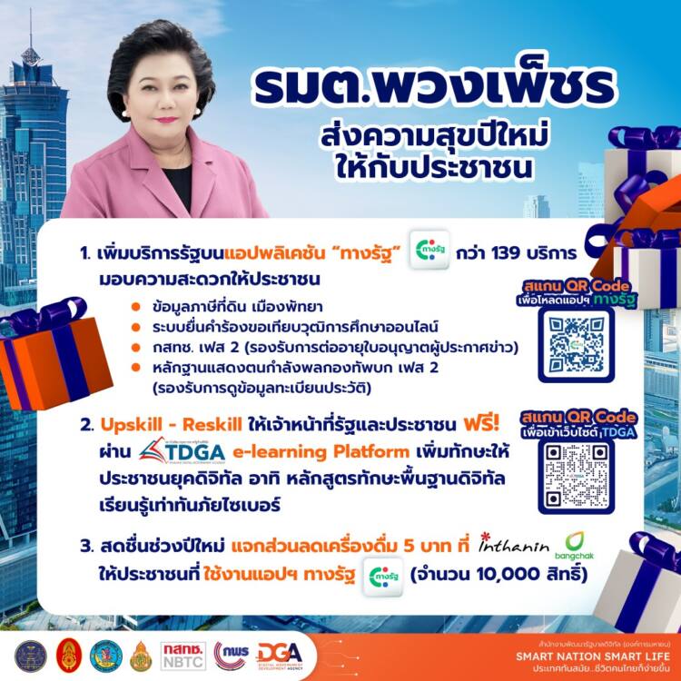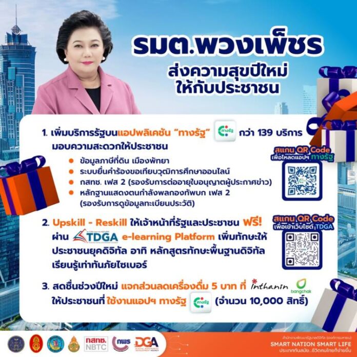 ดร.สุพจน์ เธียรวุฒิ ผู้อำนวยการสำนักงานพัฒนารัฐบาลดิจิทัล กล่าวว่า DGA ได้เข้าร่วมส่งมอบความสุขให้ประชาชนในปีใหม่นี้ด้วยการเพิ่มบริการรัฐบนซูเปอร์แอปพลิเคชัน ‘ทางรัฐ’ เช่น ตรวจสอบข้อมูลภาษีที่ดินออนไลน์ เมืองพัทยา ระบบยื่นคำร้องขอเทียบวุฒิการศึกษาออนไลน์ บัตรผู้ประกาศข่าวชั่วคราว (กสทช.) เฟส 2 หลักฐานแสดงตนกำลังพลกองทัพบก เฟส 2 พร้อมเปิดหลักสูตร Upskill/Reskill ให้เจ้าหน้าที่รัฐและประชาชน ฟรี! ผ่านเว็บไซต์ tdga.dga.or.th เพิ่มทักษะยุคดิจิทัลพร้อมดาวน์โหลดใบประกาศได้ทันที และล่าสุดร่วมกับ บริษัท บางจากรีเทล จำกัด มอบความสดชื่นช่วงปีใหม่แจกส่วนลดเครื่องดื่ม 5 บาท ที่ร้าน Inthanin ผ่านแอปฯ ทางรัฐ (จำนวน 10,000 สิทธิ์) เริ่มตั้งแต่วันที่ 28 ธันวาคม ถึง 31 มกราคม 2567