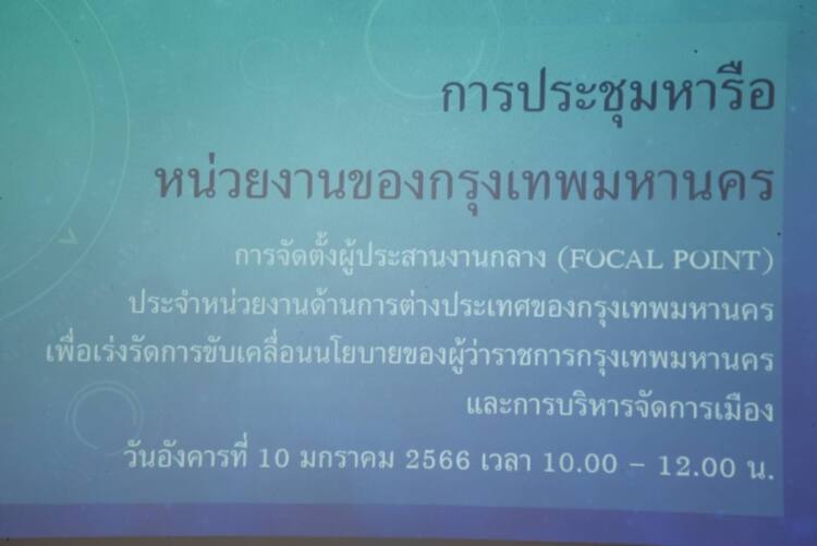 อย่างไรก็ตาม การประชุมดังกล่าว เป็นการประชุมเพื่อหารือกำหนดแนวทางในการเพิ่มประสิทธิภาพการดำเนินงานด้านการต่างประชุม รวมทั้งรับฟังปัญหาอุปสรรคในการดำเนินงานด้านการต่างประเทศรวมทั้งรองรับทิศทางและนโยบายการพัฒนาเมืองของผู้ว่าราชการกรุงเทพมหานครแลกเปลี่ยนความคิดเห็น แนวทางการประสานความร่วมมือและการดำเนินการของหน่วยงานกรุงเทพมหานคร เพื่อขับเคลื่อนงานด้านการต่างประเทศ รวมทั้งการแต่งตั้งคณะกรรมการคณะทำงานเพื่อขับเคลื่อนงานด้านการต่างประเทศ เพื่อให้ทุกหน่วยงานเดินหน้างานด้านการต่างประเทศไปพร้อม ๆ กัน