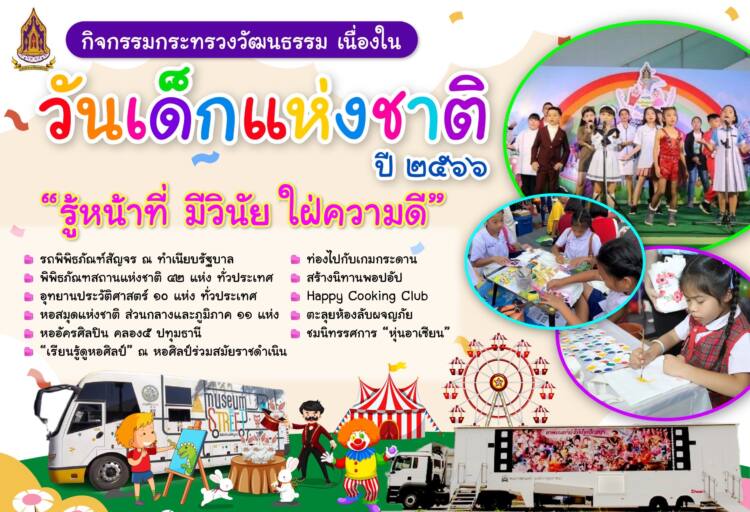 วธ.เผยโพลเด็กไทย ปี’66 ร้อยละ 63.97 รู้คำขวัญวันเด็ก “รู้หน้าที่ มีวินัย ใฝ่ความดี” ฝันอยากเป็นอาชีพ “ครู” มากที่สุด อยากไปร่วมงานวันเด็กที่โรงเรียน-หน่วยงานราชการ-สวนสนุก-พิพิธภัณฑ์ เป็นอันดับแรกๆ แนะให้จัดกิจกรรมส่งเสริมเด็กด้านคุณธรรม จริยธรรม ความรู้ ขณะที่กิจกรรมด้านศิลปวัฒนธรรมของ วธ. ที่เด็กอยากร่วมงาน “เด็กดีวิถีไทย” ชมแหล่งเรียนรู้ฟรีทั่วประเทศ และ“เรียนรู้ดูหอศิลป์” มากที่สุด