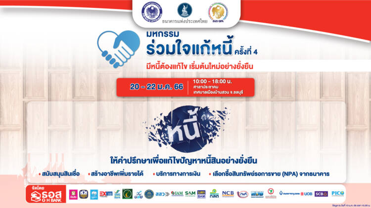 ธอส. ผนึกกำลังสถาบันการเงิน จัดงานร่วมใจแก้หนี้ฯ สัญจร ครั้งที่ 4 จ.ชลบุรี ขนมาตรการแก้ไขหนี้ เติมเงิน เสริมสภาพคล่องช่วยเหลือประชาชน วันที่ 20-22 มกราคม 2566 นี้ ณ ศาลาประชาคมเทศบาลเมืองบ้านสวน จ.ชลบุรี