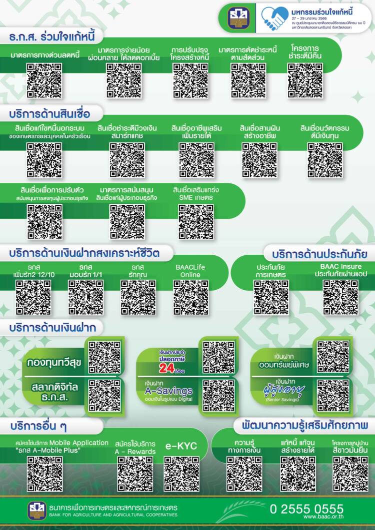ธ.ก.ส. ลงพื้นที่ดูแลปัญหาหนี้สินเกษตรกรแบบครบวงจรในงาน “มหกรรมร่วมใจแก้หนี้ มีหนี้ต้องแก้ไข เริ่มต้นใหม่อย่างยั่งยืน” ครั้งที่ 5 จังหวัดสงขลา พร้อมกำหนดแนวทางและมาตรการในการลดภาระด้านหนี้สิ อาทิ การปรับปรุงโครงสร้างหนี้ โครงการชำระดีมีคืน มาตรการตัดชำระหนี้ตามสัดส่วน มาตรการจ่ายน้อยผ่อนคลาย ได้ลดดอกเบี้ย และมาตรการทางด่วนลดหนี้ ควบคู่กับการเติมทุนเสริมสภาพคล่องในอัตราดอกเบี้ย ร้อยละ 4 พิเศษ ! สำหรับลูกค้าที่ลงทะเบียนแอปพลิเคชัน A-Mobile Plus หรือเพิ่มเพื่อน Line Official @BAACFAMILY หรือยืนยันตัวตนผ่านบริการ e-KYC รับของที่ระลึกสุดพิเศษ และแคมเปญพิเศษ WoW WoW WoW รับส่วนลดทันที 4 ต่อ โอกาสนี้ ขอเชิญชวนพี่น้องเกษตรกรเข้าร่วมงานระหว่างวันที่ 27 – 29 มกราคมนี้ ณ ศูนย์ประชุมนานาชาติฉลองสิริราชสมบัติครบ 60 ปี มหาวิทยาลัยสงขลานครินทร์ อำเภอหาดใหญ่ จังหวัดสงขลา