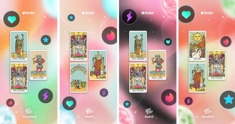 Tinder รู้ว่าบรรดาคนโสดชาวไทยที่แสดงออกถึงตัวตนของพวกเขาในด้านที่ดีที่สุด ต้องการสร้างความสัมพันธ์ที่แท้จริงกับใครสักคนบนแอพ Tinder จึงได้ร่วมมือกับ มูเตเวิร์ล ในการออกแบบและจัดทำวอลล์เปเปอร์เสริมดวง 8 แบบ เพื่อเสริมดวงความรักแบบสุดปัง ก่อนไปปัดขวาบนแอพ ซึ่งสามารถเข้าไปดาวน์โหลดฟรีได้ที่นี่