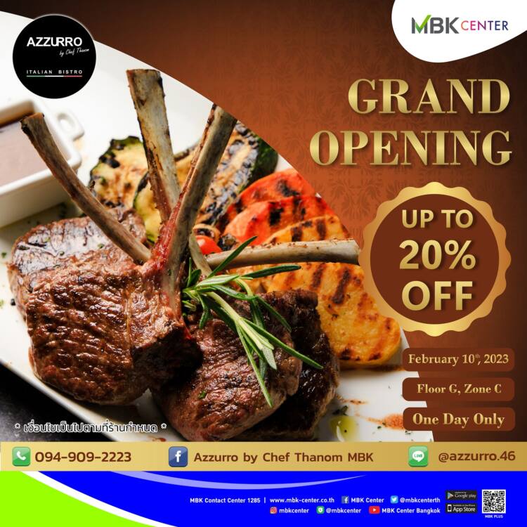 ศูนย์การค้าเอ็ม บี เค เซ็นเตอร์ เอาใจฟู้ดเลิฟเวอร์ชี้พิกัดร้านอาหารอิตาเลียนเปิดใหม่ AZZURRO by Chef Thanom เสิร์ฟเมนูต้นตำรับอิตาลี วัตถุดิบคุณภาพ รสชาติถูกปากคนไทย ณ ชั้น G โซน C พิเศษเฉพาะวันศุกร์ที่ 10 กุมภาพันธ์ 2566 วันเดียวเท่านั้นฉลองเปิดร้านใหม่จัดโปรโมชันสุดพิเศษ ส่วนลด 20 %