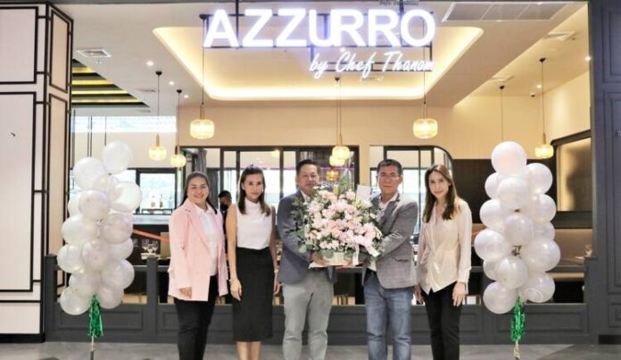 นายวิศาล สิปิยารักษ์ ประธานเจ้าหน้าที่บริหารสายบริหารพื้นที่เช่าและผู้เช่าสัมพันธ์ (ที่ 4 จากซ้าย) พร้อมด้วย นางสาวฐิติรัตน์ ประสงค์ผล ผู้อำนวยการฝ่ายพื้นที่เช่าและผู้เช่าสัมพันธ์ บริษัท เอ็ม บี เค จำกัด (มหาชน) (ที่ 2 จากซ้าย) นำทีมผู้เช่าสัมพันธ์ มอบช่อดอกไม้แสดงความยินดีกับ นายสุรเดช สร้อยรุ่งเรือง กรรมการบริหาร บริษัท พอลดี มันนี่ จำกัด (ที่ 3 จากซ้าย) เนื่องในโอกาสเปิดร้านอาหารอิตาเลียนเมนูต้นตำรับ AZZURRO by Chef Thanom ณ ชั้น G โซน C เมื่อเร็ว ๆ นี้