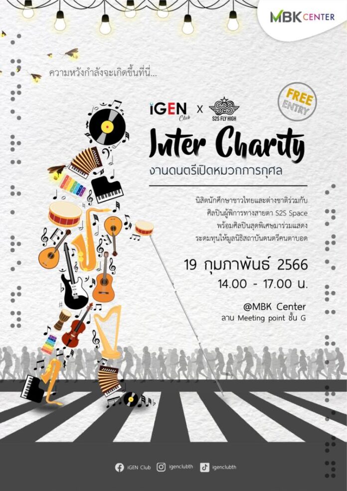 เดินหน้าสร้างคอมมูนิตี้ของคนรุ่นใหม่สนับสนุนพื้นที่ให้เยาวชนจัดกิจกรรมเชิงสร้างสรรค์อย่างต่อเนื่อง ศูนย์การค้าเอ็ม บี เค เซ็นเตอร์ ชวนฟังเพลงไพเราะอิ่มบุญอิ่มใจในงาน Inter Charity ดนตรีเปิดหมวกการกุศล ในวันอาทิตย์ที่ 19 กุมภาพันธ์ 2566 ตั้งแต่เวลา 14.00 น. – 17.00 น. บริเวณลานกิจกรรม Meeting point ชั้น G จัดโดย นิสิตนักศึกษาชาวไทยและต่างชาติ ร่วมกับ ศิลปินผู้พิการทางสายตา S2S Space จากมูลนิธิสถาบันดนตรีคนตาบอด พร้อมศิลปินสุดพิเศษ ร่วมแสดงดนตรี เพื่อระดมทุนมอบให้กับมูลนิธิสถาบันดนตรีคนตาบอด โดยใช้เสียงเพลงเป็นสื่อกลางในการนำเสนอความหลากหลายทางภาษา ซึ่งภายในงานมีการออกบูธเล่นเกมต่าง ๆ เพื่อส่งเสริมและสร้างความเข้าใจอันดีเรื่องความเท่าเทียมระหว่างบุคคลทั่วไปและผู้พิการทางสายตา สร้างความเข้าใจเกี่ยวกับความหลากหลายทางภาษา วัฒนธรรมและสังคม นำไปสู่การยอมรับความแตกต่างของกันและกัน รวมถึงความสำคัญและความภาคภูมิใจในภาษาแม่เนื่องในวันภาษาแม่สากล