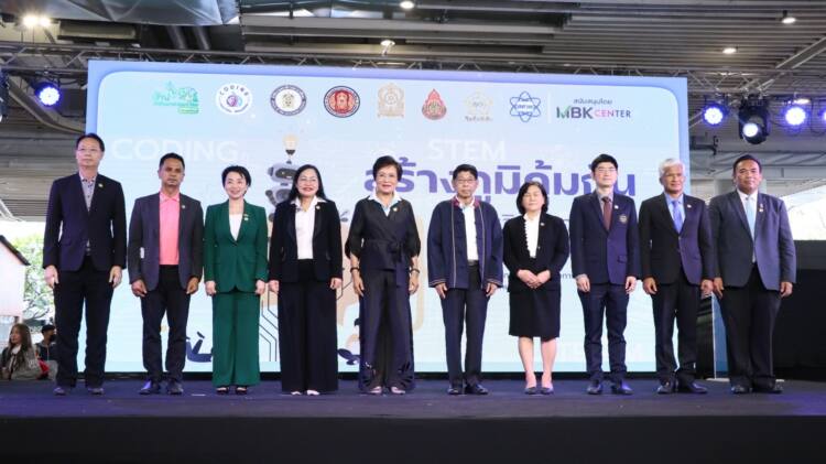 นางสาวพุทธชาด ศรีนิศากร ผู้ช่วยประธานเจ้าหน้าที่บริหารสายการตลาด บริษัท เอ็ม บี เค จำกัด (มหาชน) (ที่ 3 จากซ้าย) ให้การต้อนรับ ดร.วิษณุ เครืองาม รองนายกรัฐมนตรี (ที่ 6 จากซ้าย) ที่ให้เกียรติมาเป็นประธาน พร้อมด้วย ดร.คุณหญิงกัลยา โสภณพนิช รัฐมนตรีช่วยว่าการกระทรวงศึกษาธิการ (ที่ 5 จากซ้าย) และผู้บริหารระดับสูงกระทรวงศึกษาธิการ ในพิธีเปิดงาน “สร้างภูมิคุ้มกัน ด้วยวิทยาศาสตร์และ CODING” ณ ลานกิจกรรม Avenue A ชั้น G ศูนย์การค้าเอ็ม บี เค เซ็นเตอร์ เมื่อเร็ว ๆ นี้