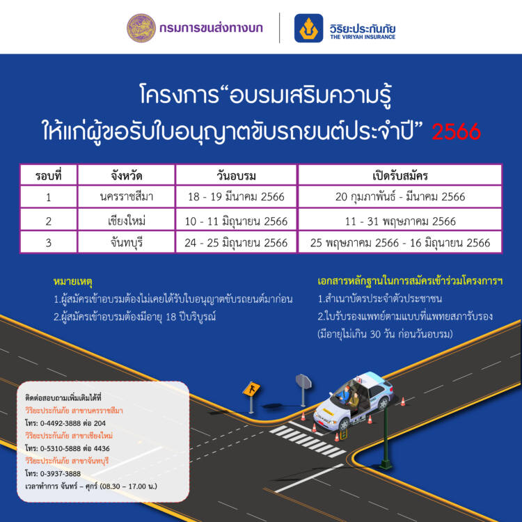 สำหรับในปี 2566 บริษัทฯ มีกำหนดจัดโครงการอบรมเสริมความรู้ให้แก่ผู้ขอรับใบอนุญาตขับรถยนต์ ส่วนภูมิภาค จำนวน 3 รุ่น โดยรุ่นแรก มีกำหนดจัดขึ้นวันที่ 18-19 มีนาคม 2566 ณ อาคารอิ่มวิเศษ โรงแรมสตาร์เวลล์ จังหวัดนครราชสีมา เปิดรับสมัครแล้วตั้งแต่วันนี้ ถึงวันที่ 8 มีนาคม 2566 ผู้สนใจสมัครสามารถติดต่อได้ที่ สำนักงานขนส่งจังหวัดนครราชสีมา โทร. 0 4437 1332 ต่อ 17 และ บมจ.วิริยะประกันภัย สาขานครราชสีมา โทร 0 4492 3888 ต่อ 204