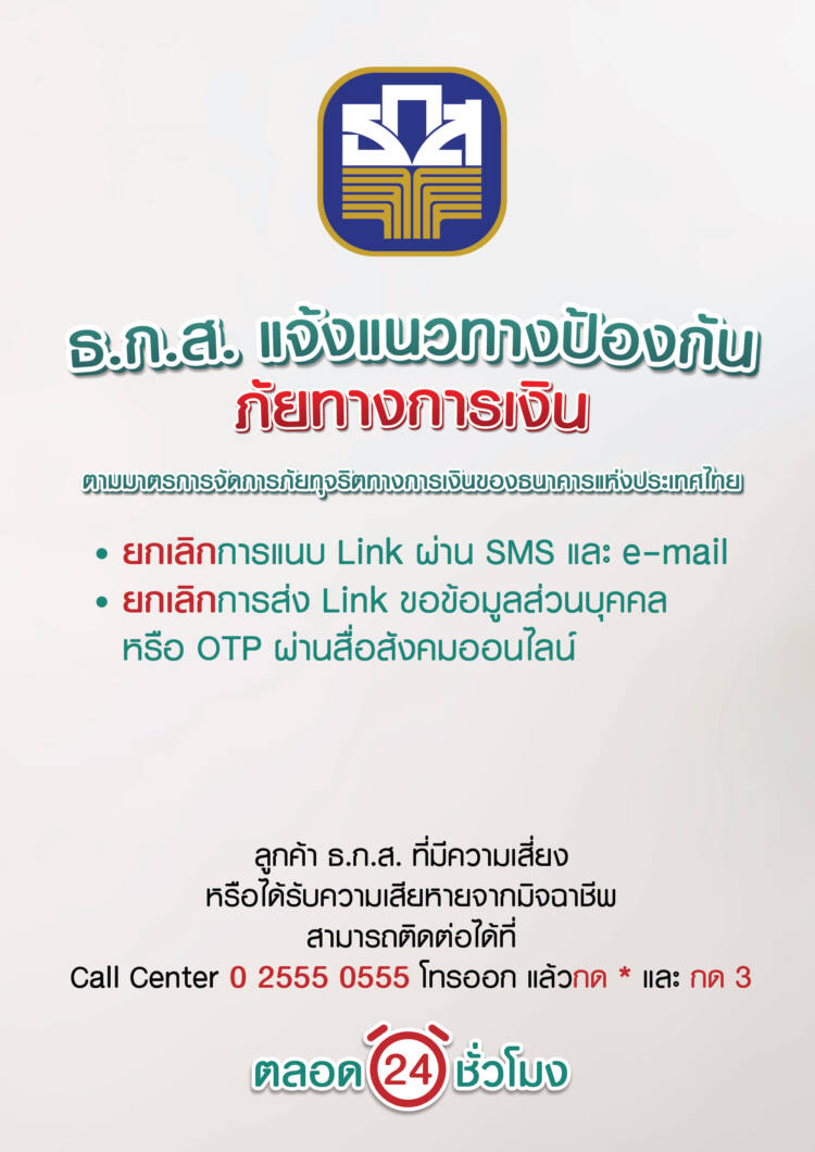 ธ.ก.ส. ขานรับนโยบายกระทรวงการคลังและธนาคารแห่งประเทศไทย เดินหน้าป้องกันภัยมิจฉาชีพทางการเงิน ผ่านมาตรการจัดการภัยทุจริตทางการเงิน ทั้งการยกเลิก SMS และอีเมลที่แนบลิงก์ทุกกรณี การพัฒนาระบบความปลอดภัยให้ทันต่อภัยทางการเงิน การตรวจจับและติดตามธุรกรรมที่เข้าข่ายผิดปกติแบบ near real- time รวมถึงการจัดตั้ง hotline สำหรับการแจ้งภัยทางการเงิน เพื่อปิดช่องว่างในการฉวยโอกาสจากมิจฉาชีพและสร้างความมั่นใจให้กับประชาชนในการทำธุรกรรมทางการเงิน กรณีพบเห็นการแอบอ้างต่าง ๆ หรือแจ้งเหตุภัยทางการเงิน ติดต่อได้ที่ศูนย์รับแจ้งเหตุภัยทางการเงินจากมิจฉาชีพ ธ.ก.ส. ตลอด 24 ชั่วโมง