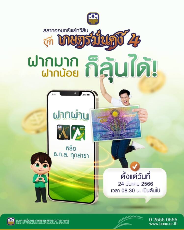 ธ.ก.ส. เปิดรับฝาก “สลากออมทรัพย์ทวีสิน ชุดเกษตรมั่นคง 4” ช่วงที่ 2 สำหรับลูกค้าและประชาชนทั่วไป ตั้งแต่ 24 มีนาคม 2566 เป็นต้นไป วงเงินรวม 30,000 ล้านบาท หน่วยละ 500 บาท ฝากครบ 3 ปี ได้รับดอกเบี้ยหน่วยละ 5 บาท พร้อมลุ้นรางวัลใหญ่ 20 ล้านบาท และรางวัลอื่น ๆ รวมมูลค่ากว่า 107 ล้านบาท ต่อเดือน เปิดรับฝากผ่านแอปพลิเคชัน ธ.ก.ส. A-Mobile หรือ A-Mobile Plus และ ธ.ก.ส. ทุกสาขาทั่วประเทศ
