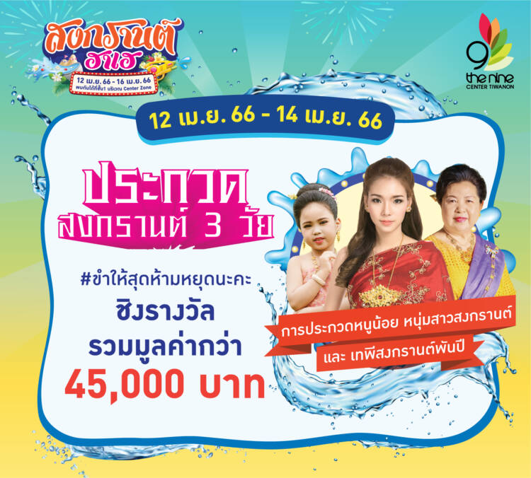 ต่อด้วยความสนุก สุดมัน ที่ศูนย์การค้าเดอะไนน์ เซ็นเตอร์ ติวานนท์ ร่วมกับ เทศบาลเมืองบางกะดี จ.ปทุมธานี จัดงาน “สงกรานต์ ฮาเฮ” ในวันพุธที่ 12 – วันอาทิตย์ที่ 16 เมษายน 2566 บริเวณ ลานไนน์ สแควร์ (เซ็นเตอร์โซน) ใช้เวลาวันหยุดยาวกับครอบครัว มาเฮฮา สนุกสนาน และเชียร์การประกวดชิงเงินรางวัลกว่า 45,000 บาท ตลอด 4 วันเต็ม อัดแน่นด้วยกิจกรรมเด็ด ดังนี้ วันพุธที่ 12 เมษายน 2566 พบกับการประกวดหนูน้อยสงกรานต์ ชมความน่ารักของน้องๆ พร้อมด้วย ความสามารถล้นเปี่ยม วันพฤหัสบดีที่ 13 เมษายน 2566 พบกับ กิจกรรมรดน้ำดำหัวผู้สูงวัย กว่า 100 ท่าน และชมการประกวดนางสงกรานต์วัยเก๋า บนเวทีเทพีพันปี ต่อด้วย วันศุกร์ที่ 14 เมษายน 2566 มาลุ้นกับการประกวดหนุ่ม – สาว ธิดาไทย-รามัญ หนุ่มไทย-รามัญ วันเสาร์ที่ 15 เมษายน 2566 ปิดท้ายความมันส์มา สนุกกับคอนเสิร์ต ศิลปินไฮไลต์ “หญิงลี ศรีจุมพล” ในเวลา 18.00 น. พร้อมชมการแสดงความสามารถจากเหล่านักเรียน จ. ปทุมธานี และกิจกรรมสระบอลยักษ์ลุ้นโชค สาดสนุก รับของรางวัล มากมายสำหรับสมาชิก MBK PLUS เพียงแสดงใบเสร็จ ช้อปหรืออิ่มภายในศูนย์ฯ 300 บาทขึ้นไป + 1 MBK Point