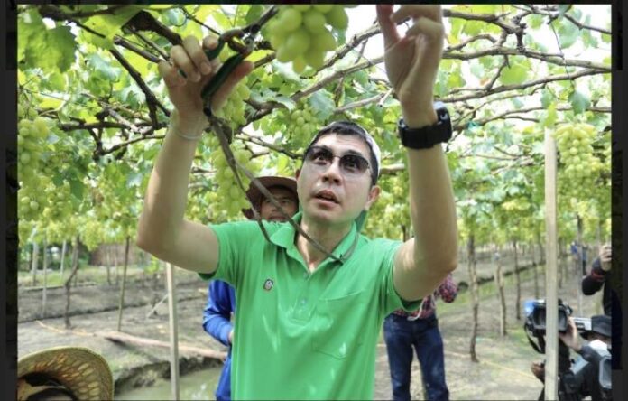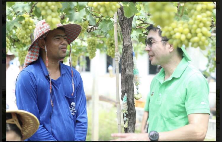 8 เมษายน 2566 นายฉัตรชัย ศิริไล ผู้จัดการธนาคารเพื่อการเกษตรและสหกรณ์การเกษตร (ธ.ก.ส.) พร้อมด้วยนายพงษ์พันธ์ จงรักษ์ รองผู้จัดการ ธ.ก.ส. นายไพศาล หงษ์ทอง และนายมานพ จินาไหม ผู้ช่วยผู้จัดการ ธ.ก.ส. ลงพื้นที่เยี่ยมชมงานสวนองุ่นเจริญผล ตำบลเจ็ดริ้ว อำเภอบ้านแพ้ว จังหวัดสมุทรสาคร ที่มีการปลูกองุ่นพันธุ์ไวท์มะละกามีรสชาติหวานอร่อยและเป็นที่นิยม โดยใช้วิธีการปลูกแบบยกร่องสวน และปลูกแบบหมุนเวียนโดยเปลี่ยนต้นใหม่ ทุก ๆ 3 ปี เพื่อให้ได้ผลผลิตที่มีคุณภาพและมีองุ่นจำหน่ายได้ตลอดทั้งปี รวมถึงการเพิ่มการปลูกองุ่นสายพันธุ์ต่างประเทศเพื่อเพิ่มความหลากหลาย โดยมีเป้าหมายในการพัฒนาคุณภาพและมาตรฐานการผลิตพืชปลอดภัย (GAP) เพื่อสร้างความมั่นใจให้กับผู้บริโภค ด้านการจัดการทางการตลาด นอกจากส่งขายไปยังตลาดผลไม้ทั่วไปแล้วยังขยายช่องทางการจำหน่ายผลผลิตผ่านสื่อออนไลน์ ได้แก่ Facebook และ TikTok รวมถึงการเปิดสวนองุ่นให้นักท่องเที่ยวสามารถเข้ามาเยี่ยมชมและทำกิจกรรมตัดองุ่น เพื่อสร้างประสบการณ์ที่ดีให้กับนักท่องเที่ยวและต่อยอดธุรกิจไปสู่การท่องเที่ยวเชิงเกษตร
