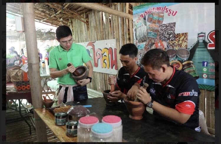 จากนั้นเดินทางไปเยี่ยมชมงานกลุ่มวิสาหกิจชุมชนบ้านชายทะเลรางจันทร์ ตำบลนาโคก อำเภอเมือง จังหวัดสมุทรสาคร ซึ่งเป็นหมู่บ้านที่ตั้งอยู่ติดกับอ่าวรูปตัว ก จึงมีทัศนียภาพที่งดงาม โดยชาวบ้านทำอาชีพประมงพื้นบ้าน เพาะเลี้ยงสัตว์น้ำ และการทำกะปิเป็นอาชีพหลัก ในช่วงสถานการณ์การแพร่ระบาดของ COVID-19 กลุ่มวิสาหกิจชุมชนฯ ต้องปรับเปลี่ยนวิธีการจำหน่ายสินค้าประเภทอาหารทะเลตากแห้ง กุ้งแห้ง ปูไข่ดองแบรนด์ “ปูจ๋ารางจันทร์” ผ่านการไลฟ์สด มีการจ้างงานเยาวชนในชุมชนเข้ามาช่วยจำหน่ายสินค้าและแพ็คสินค้า เพื่อสนับสนุนให้เยาวชนใช้เวลาว่างให้เป็นประโยชน์ นอกจากนี้ ชุมชนฯ ยังเป็นศูนย์เรียนรู้เพื่อการพัฒนาฯ ที่เปิดโอกาสให้นักท่องเที่ยวเข้ามาเยี่ยมชมและเรียนรู้วิถีชุมชนผ่านกิจกรรมต่าง ๆ เช่น การทำผ้ามัดย้อม การตำกะปิแบบโบราณ การไถกระดานเก็บหอยจากบริเวณชายฝั่ง และการทำไข่เค็มพอกโคลน เป็นต้น