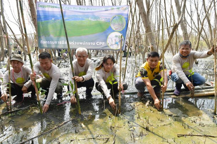 ซีพีเอฟ มุ่งมั่นดำเนินธุรกิจด้วยความรับผิดชอบต่อสังคมและสิ่งแวดล้อม ภายใต้กลยุทธ์ 3 เสาหลักสู่ความยั่งยืน “อาหารมั่นคง สังคมพึ่งตน และดิน น้ำ ป่าคงอยู่” เพื่อสร้างความมั่นคงทางอาหาร (Food Security) ทั้งในภาวะปกติและในสถานการณ์วิกฤต โดยเฉพาะอย่างยิ่ง ภายใต้ความท้าทายจากผลกระทบของการเปลี่ยนแปลงสภาพภูมิอากาศ (Climate Change) บริษัทฯตระหนักถึงการมีส่วนร่วมเพิ่มพื้นที่ป่าต้นน้ำ ป่าชายเลน และการปลูกต้นไม้ในสถานประกอบการ ซึ่งในการดำเนินโครงการ “ซีพีเอฟ ปลูก ปัน ป้อง ป่าชายเลน” ตั้งแต่ปี 2557- 2561 อนุรักษ์และฟื้นฟูป่าชายเลน รวม 2,400 ไร่ ปัจจุบันเข้าสู่ระยะที่สองของโครงการ (ปี 2562-2566) มีเป้าหมายอนุรักษ์ ฟื้นฟูและปลูกป่าใหม่ อีก 2,800 ไร่ ในพื้นที่ยุทธศาสตร์ จ.สมุทรสาคร ระยอง และตราด./