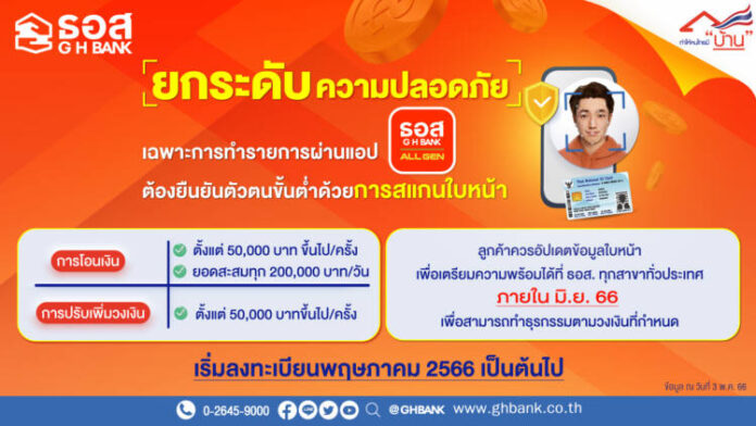 ทั้งนี้ ทางธนาคารขอให้ผู้ใช้บริการ Application : GHB ALL GEN นำบัตรประชาชนมาลงทะเบียนใบหน้าที่ ธอส. ทุกสาขาทั่วประเทศ ตั้งแต่วันนี้เป็นต้นไป สอบถามรายละเอียดเพิ่มเติมได้ที่ ธอส. ทุกสาขาทั่วประเทศ G H Bank Call Center โทร 0-2645-9000 หรือ Facebook Fanpage ธนาคารอาคารสงเคราะห์ และติดตามข่าวสารของธนาคาร ได้ที่ Mobile Application : GHB ALL GEN และ www.ghbank.co.th