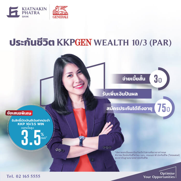 สามารถดูรายละเอียดข้อมูลผลิตภัณฑ์บัญชีเงินฝากประจำพิเศษ KKP 10/3.5 WIN พร้อมทั้งอัตราดอกเบี้ยและเงื่อนไขได้ที่ https://link.kkpfg.com/NwODm หรือติดต่อธนาคารเกียรตินาคินภัทรทุกสาขา หรือ โทร. 021655555, สำหรับผลิตภัณฑ์ KKPGEN Wealth 10/3 (Par) พิจารณารับประกันภัย โดย บมจ. เจนเนอราลี่ ประกันชีวิต (ไทยแลนด์) ธนาคารเป็นเพียงนายหน้าประกันชีวิต ทั้งนี้ ผู้ซื้อควรทำความเข้าใจในรายละเอียด ความคุ้มครอง และเงื่อนไขก่อนตัดสินใจทำประกันภัยทุกครั้ง