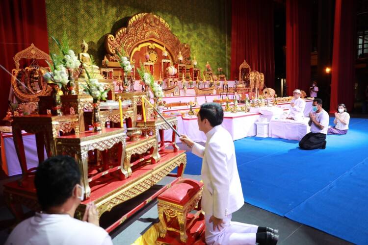 อย่างไรก็ตาม ในเวลา 09.09 น. โดยครูปี๊บ คงลายทอง ผู้ประกอบพิธีได้อ่านโองการประกอบการไหว้ครู พร้อมกล่าวคำถวายข้าวพระพุทธ และถวายเครื่องสังเวย ปี่พาทย์บรรเลงประกอบพิธีตามลำดับ จากนั้น ศิลปิน นักร้อง นักดนตรีไทย ทั้งมืออาชีพและสมัครเล่น รวมถึงศิลปินรุ่นเยาว์ ในจังหวัดสุพรรณบุรีและใกล้เคียง เข้ารับการเจิม รับน้ำมนต์ และไม้มงคล (ซึ่งประกอบไปด้วยใบเงิน ใบทอง ใบมะตูม และหญ้าแพรก ม้วนรวมกันและผูกด้วยด้ายสายสินธุ์) เพื่อสร้างสิริมงคล ต่อด้วยพิธีครอบครูดนตรีไทย ตามลำดับ