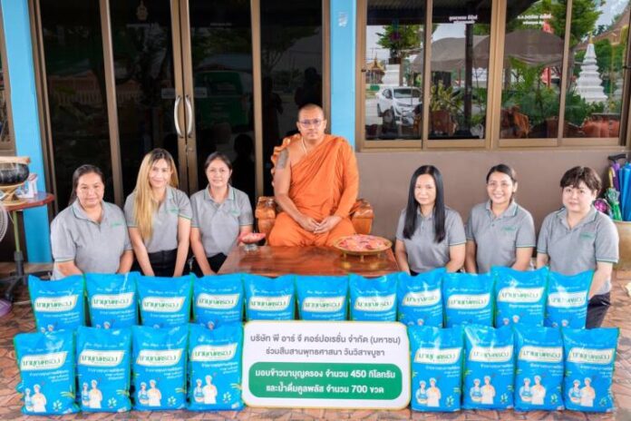 นางพาณิภัค ฉัตรวงศ์ตระกูล (ที่ 5 จากซ้าย) ผู้อำนวยการฝ่ายทรัพยากรบุคคลและธุรการ บริษัท พี อาร์ จี คอร์ปอเรชั่น จำกัด (มหาชน) นำทีมพนักงานจิตอาสาในเครือพี อาร์ จี คอร์ปอเรชั่น ทำบุญถวายข้าวขาวคุณภาพดีคัดพิเศษ จากข้าวมาบุญครอง จำนวน 450 กก. และน้ำดื่มคูลพลัส จำนวน 700 ขวด ที่ได้รับการสนับสนุนจากบริษัทฯ และพนักงานในเครือ พี อาร์ จี คอร์ปอเรชั่น เพื่อร่วมสืบสานวันสำคัญทางพุทธศาสนา เนื่องในวันวิสาขบูชา โดยมี พระปลัดพงษ์ศิริ สิริวํโส (ที่ 4 จากซ้าย) เจ้าอาวาสวัดตลาดใต้ เป็นผู้รับมอบ เพื่อนำไปช่วยเหลือผู้ป่วยติดเตียงภายในชุมชนโดยรอบวัดตลาดใต้ จังหวัดปทุมธานี และนำไปช่วยเหลือเด็กกำพร้า ในอุปถัมภ์ของวัดบ้านอ้อ จังหวัดพระนครศรีอยุธยา เมื่อเร็ว ๆ นี้