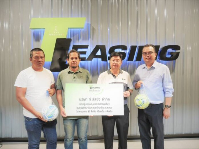 นายมงคล เพียรพิทักษ์กิจ กรรมการผู้จัดการ (ที่ 3 จากซ้าย) พร้อมด้วย นายพศิน สินธนภัทร รองกรรมการผู้จัดการสายการตลาดเช่าซื้อ บริษัท ที ลีสซิ่ง จำกัด (ที่ 4 จากซ้าย) ธุรกิจเช่าซื้อรถจักรยานยนต์ ในเครือเอ็ม บี เค ร่วมมอบลูกฟุตซอลและเงินสนับสนุน ในโครงการ “ที ลีสซิ่ง เปื้อนยิ้ม แต้มฝัน” ให้กับ ทีมฟุตซอลโกลหนู ชุมชนพัฒนาริมคลองบ้านป่า เขตสวนหลวง โดยมี นายอีซา ยะลาน ประธานชุมชนฯ (ที่ 2 จากซ้าย) เป็นตัวแทนรับมอบพร้อมนำน้อง ๆ ร่วมแข่งขันหารายได้มาพัฒนาลานกีฬาและชุมชนต่อไป ณ สำนักงาน ที ลีสซิ่ง ชั้น 3 ศูนย์การค้าพาราไดซ์ เพลส เมื่อเร็ว ๆ นี้