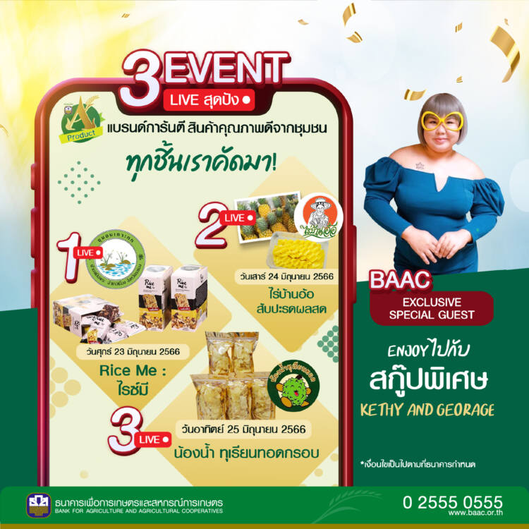 นอกจากนี้ ยังมีกิจกรรม A-Product LIVE จำหน่ายผลิตภัณฑ์คุณภาพจากเกษตรกรลูกค้าในราคาพิเศษ ทุกวัน พร้อมสกู๊ปพิเศษจาก Kethy and George ผ่าน Facebook page : ธกส บริการด้วยใจ และ Youtube : BAAC Thailand อาทิ ขนมข้าวไรซ์เบอร์รี สแน็คบาร์ จาก Rice me ชุมชนเกาะกก สับปะรดผลสดจากไร่บ้านอ้อ และทุเรียนทอดกรอบจากแบรนด์น้องน้ำ อย่าพลาด! พบกับกิจกรรมดี ๆ และสิทธิประโยชน์มากมาย ที่บูธ ธ.ก.ส. ในงาน Thailand Smart Money สัญจรระยอง ในวันที่ 23 – 25 มิถุนายนนี้