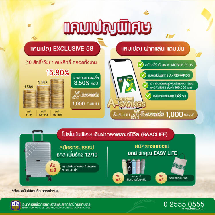 ด้านผลิตภัณฑ์เงินฝากสงเคราะห์ชีวิต ธ.ก.ส. มุ่งส่งเสริมการสร้างภูมิคุ้มกันทางการเงินและการออมแบบยั่งยืนด้วยเงินฝากสงเคราะห์ชีวิต พิเศษเฉพาะในงาน! เมื่อสมัครกรมธรรม์ ธกส เพิ่มรัก2 12/10 รับทันที กระเป๋าเดินทางล้อลากขนาด 20 นิ้ว หรือสมัครกรมธรรม์ ธกส รักคุณ Easy Life ผ่านแอปพลิเคชัน BAACLife Online รับกระเป๋าผ้าแคนวาส หรือกระบอกน้ำเก็บความร้อน – เย็น โดยลูกค้าที่สมัครกรมธรรม์เงินฝากสงเคราะห์ชีวิต ทุกประเภท ได้รับสิทธิลุ้นรับทองคำในแคมเปญปลูกรัก รับโชค น้ำหนักกว่า 90 บาท มูลค่ากว่า 2.9 ล้านบาท 1 สิทธิ์/กรมธรรม์ ระยะเวลาตั้งแต่วันนี้จนถึง 15 ตุลาคม 2566